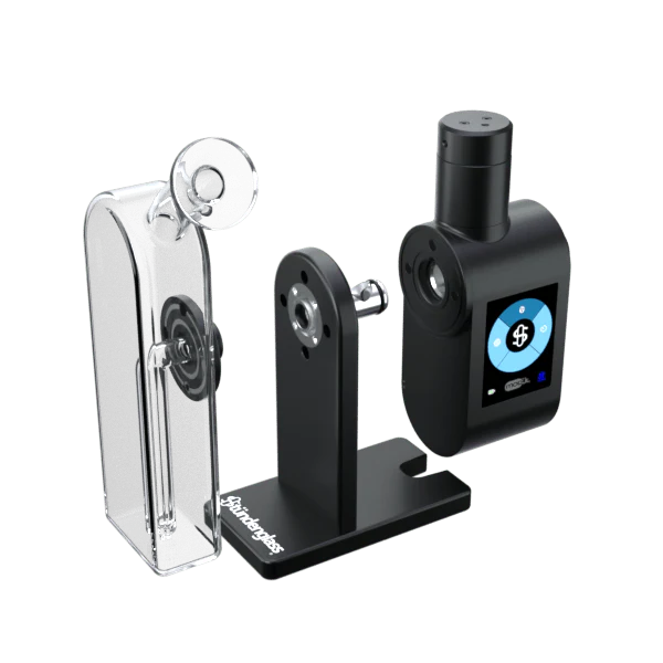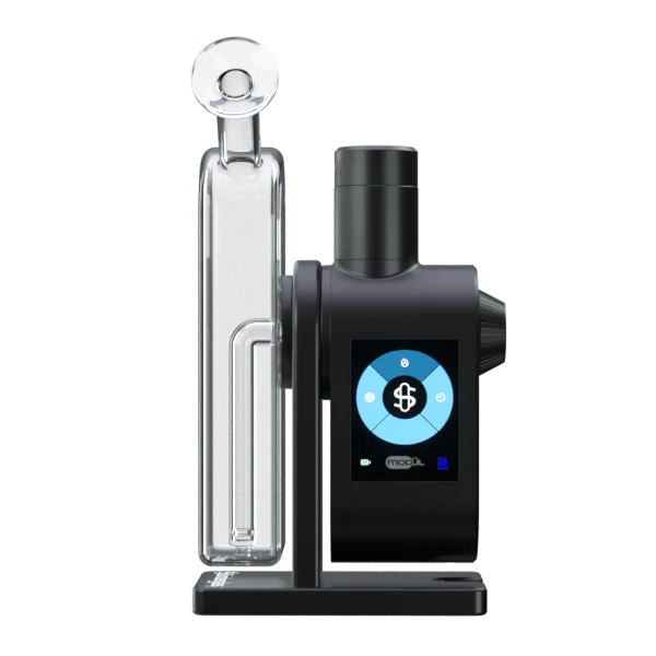 Introducing the Stündenglass Modül Dok Dry Material Bundle. Coupling a Modül for Dry Material with the Dok allows the user to experience all of the Modül features without the need for a gravity infuser. The Dok features 3mm borosilicate glass, a 4 hole welded stem percolator, and an anodised aluminum stand, and attaches seamlessly to the Modül via a standard Stündenglass magnetic adapter to create a powerful all in one device that can heat dry material to temperature in as little as 15 seconds. A 90° USB-C charging cable allows for simultaneous charging and use thanks to easy access to the Modül charging port.
